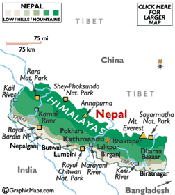 Nepal is a land-locked Himalayan country bordered by two economic giants, China (Tibet Autonomous Region) to the North and India in the East, West and South. Home to eight of the ten highest mountains in the world including Mount Everest, the Himalayan mountain region are where 80% of the 30 million Nepalese live. Nepal has roughly three ecological regions: the mountains (35%), the hills (42%) and the Terai (23%).